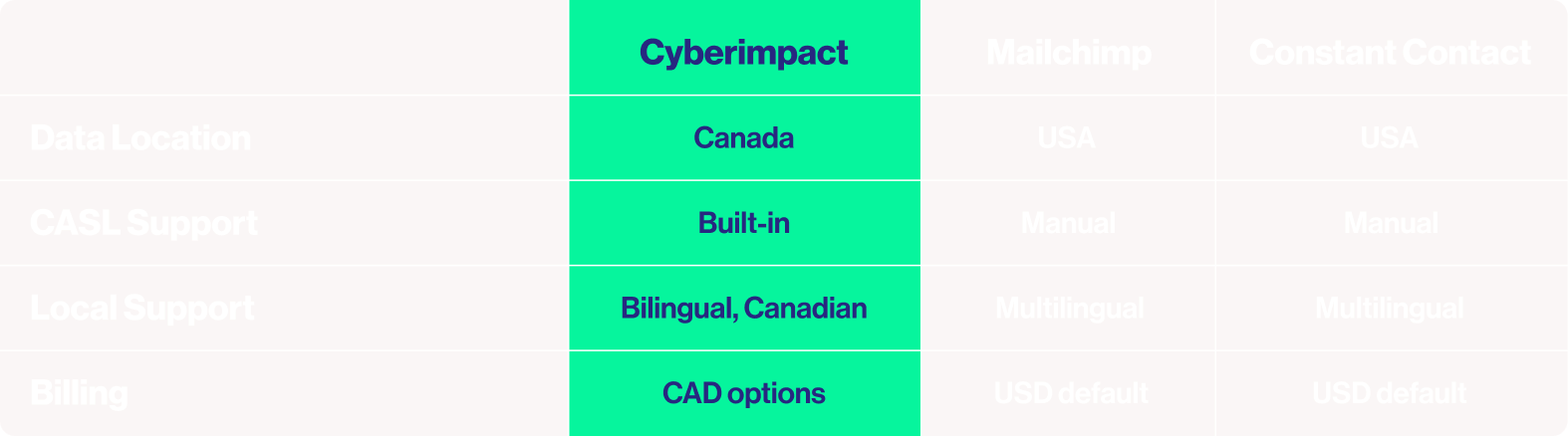 Cyberimpact offers simple yet tailored email tools, bilingual support, and compliance features for Canadian teams.